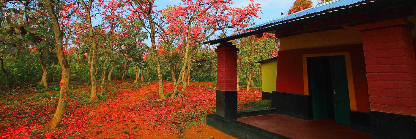 The Resort having 7 Bighas of landscape and 1600 Palash Trees has a romantic red view during the spring season (specially in the month of March) which anyone can enjoy from the window and the verandah of each room of the resort. One gets overwhelmed with such a fascinating beauties and serenity which develop the urge to visit PALASHBARI again and again. If you are interested in wild life and nature study, please drop in to INCREDIBLE PALASHBARI whether it is for a weekend or for a longer duration.